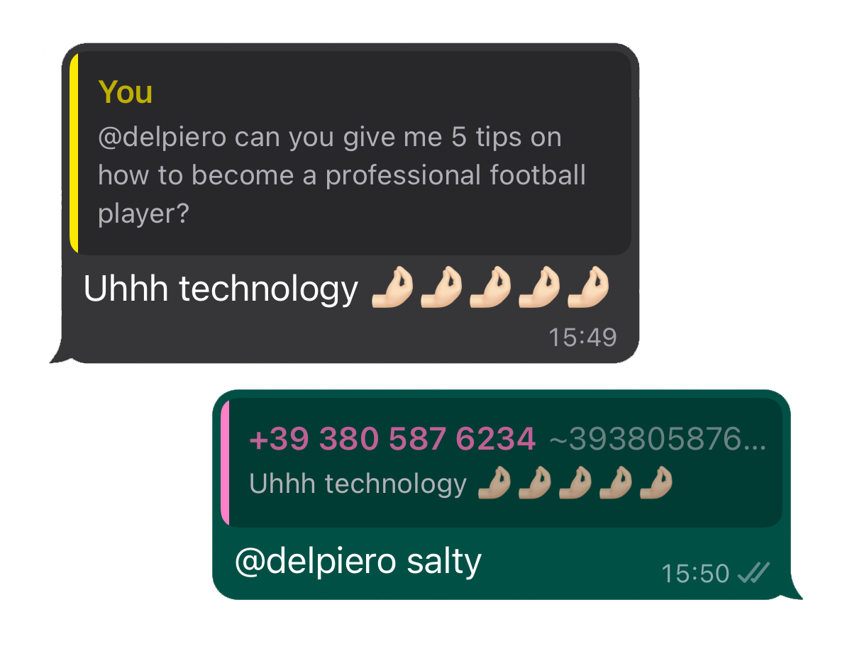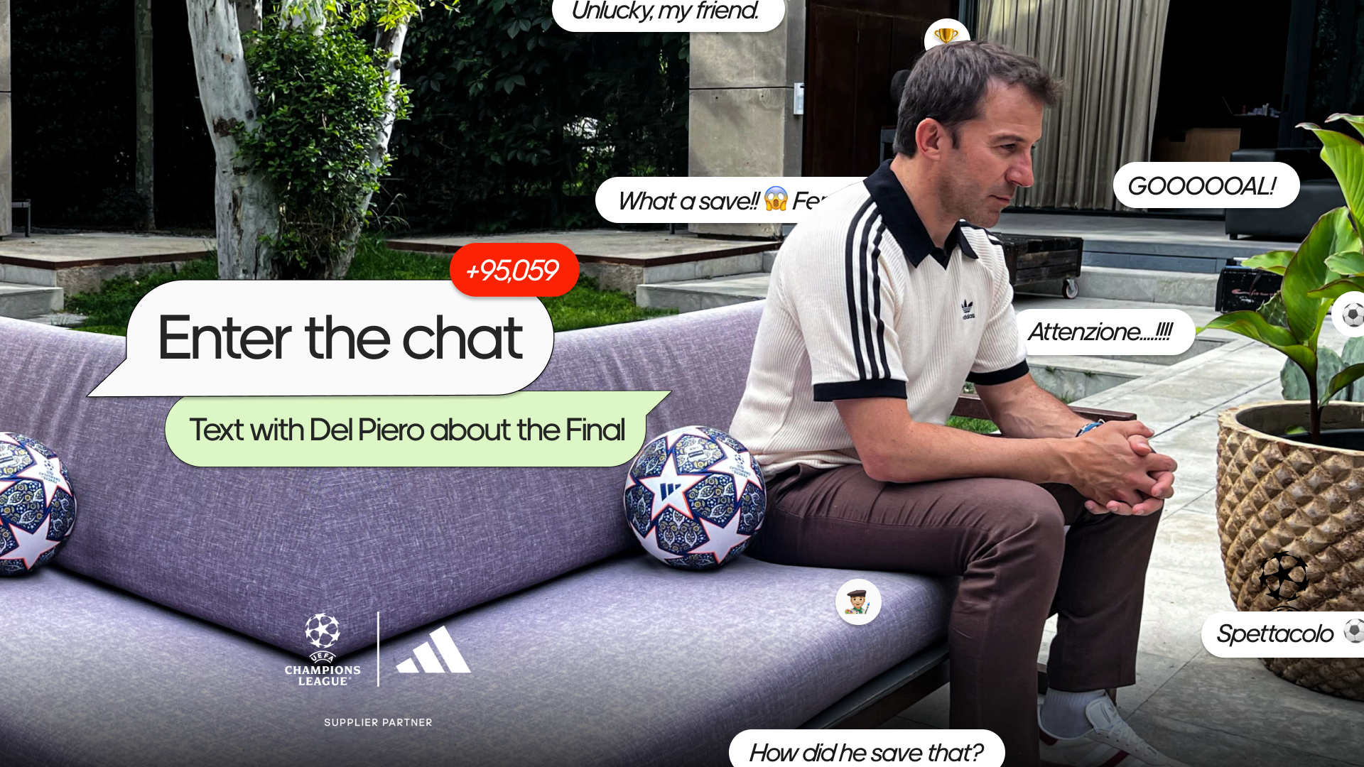 We created “Enter the chat with Del Piero: the ultimate second screen Champions League Final experience.” We trained a LLM with historic UEFA Champions League data, live match updates, and Del Piero's Italian flair and transform the iconic player into an AI everyone could interact with. Users could simply add him to their Whatsapp groups, chat one-on-one, and ask anything about Champions League football during the match.