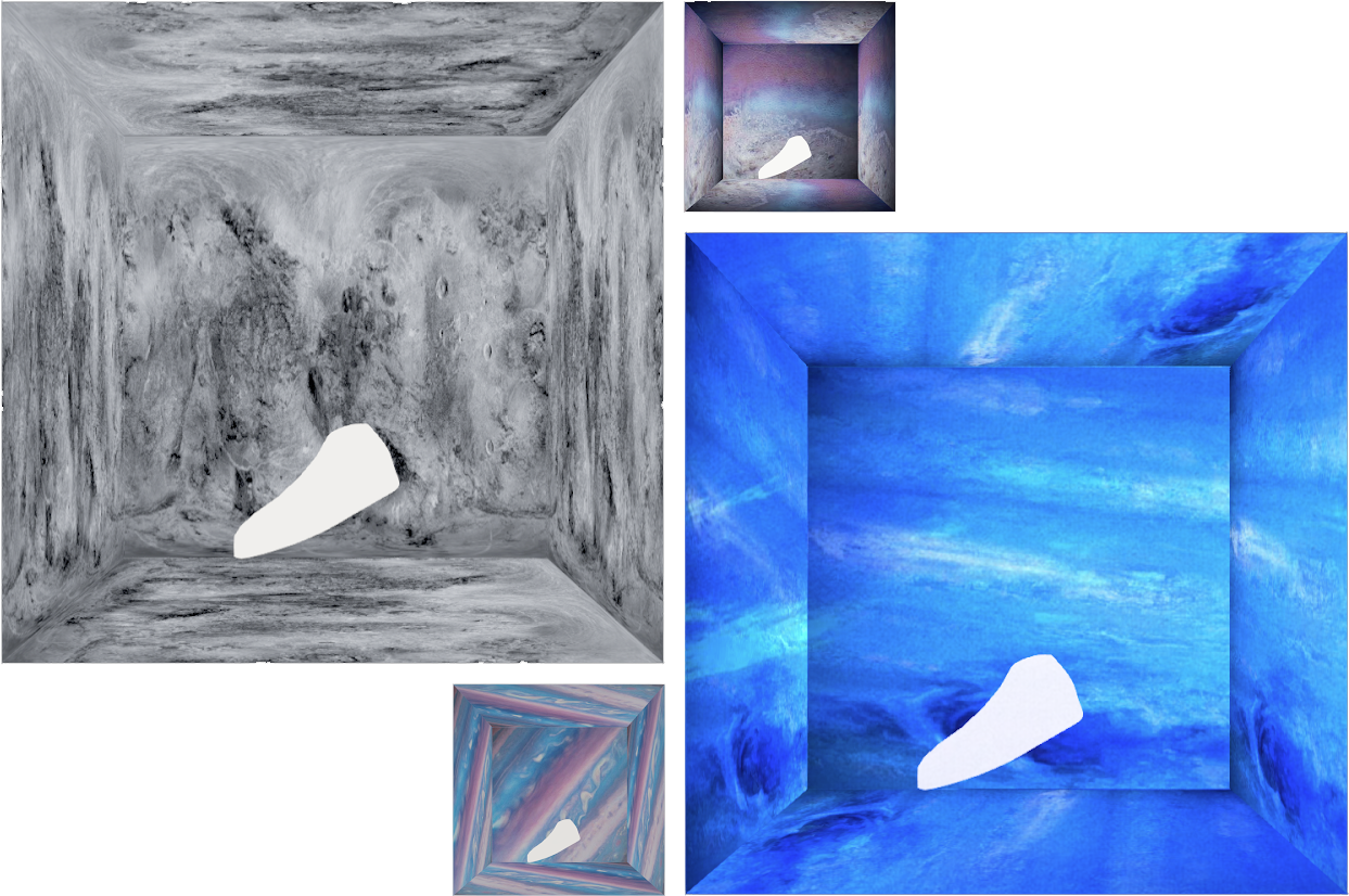 The abstract installation reminded of a futuristic space station. Borrowing aesthetics, textures and structures from Space we built a visual vernacular that breathes Spaces without the cliché connotations. We built different visual worlds for each artist built on their product. From a Jupiter Infrared blue pink to a moon grey and Neptune blue. Each colour pattern carefully selected to make the artist and product pop.